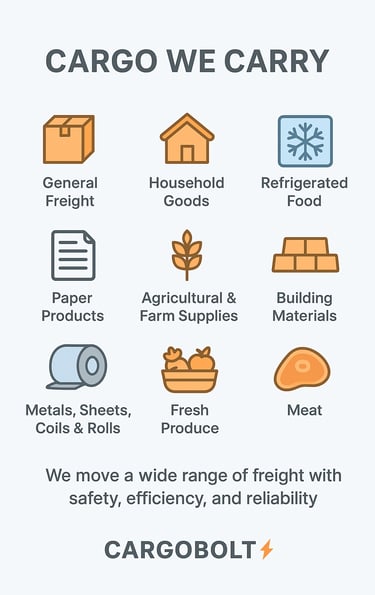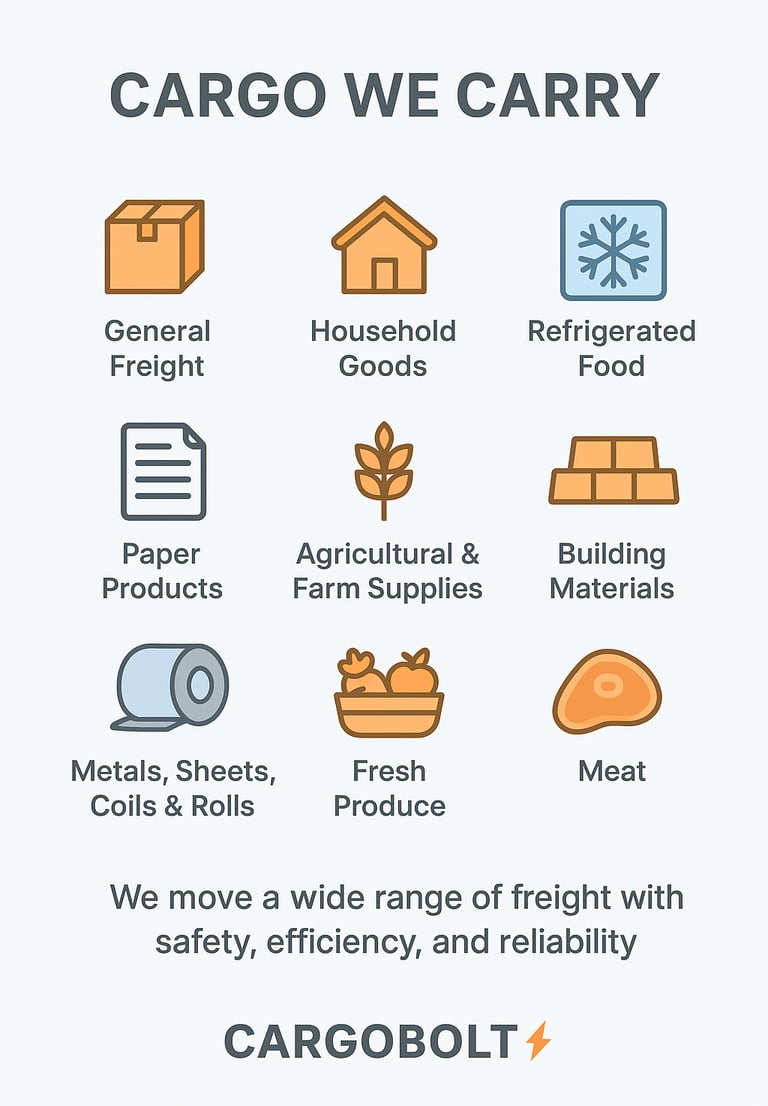 At Cargobolt Logistics, we move a wide range of freight with safety, efficiency and reliability. our versatile fleet ensures every shipment-big or small - arrives on time and in excellent condition.
